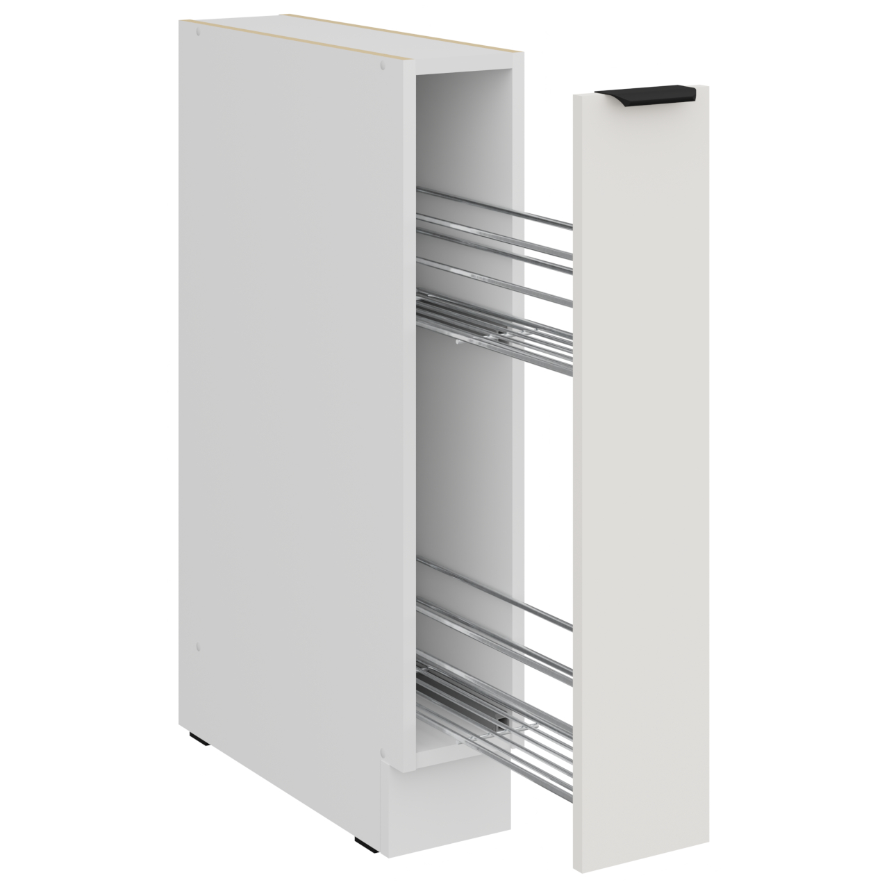 Wnętrze szafki w kolorze białym. Otwory na uchwyt wiercone nieprzelotowo. Kosz CARGO montaż boczny na prawym boku. |